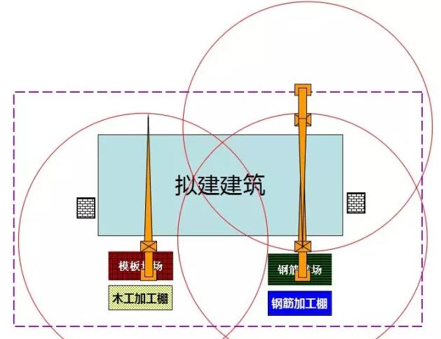 2.塔吊布置要充分考慮塔吊的需利用率,根據(jù)主要材料的存放場地要便于起吊,盡量減小吊運過程中塔臂轉(zhuǎn)角,以提高塔吊利用率。在群塔平面布置時,既要任務(wù)區(qū)域明確,又要方便互相應(yīng)急支援。在群塔平面設(shè)計時,各相鄰塔吊之間,必須滿足低塔吊的塔臂不危及高塔吊塔身的安全。
